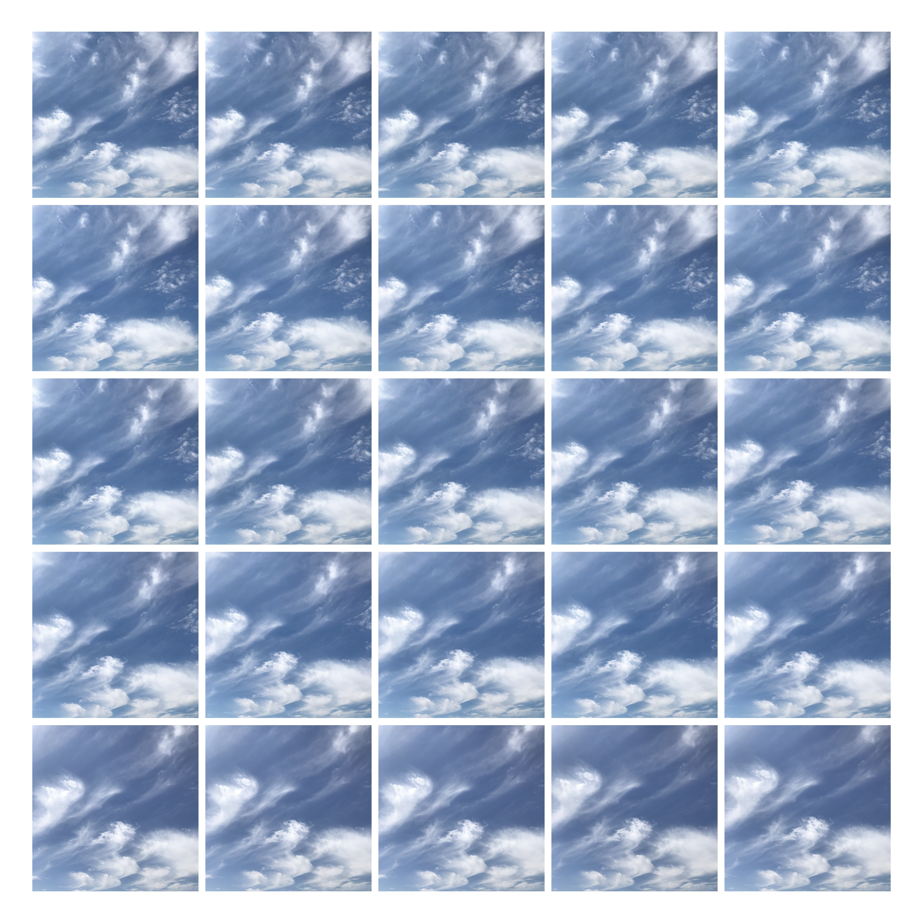 „25 Times The Sky“ is conceived as a meditation on continuous change and the impossibility to capture a fleeting, never repeating reality. Started on January 1st, 2022, I take 25 consecutive pictures of the sky every day. These I arrange into a 5x5 grid without further processing.